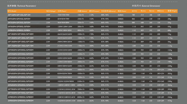 | SJF100JDN/SJF100GL/SJF100N | 220v | 266w/266w/260w | 1000m3/h | 170pa | 86%-91% | 36dB(A) | 1143 | 809 | 342 | 200 | 72KG |