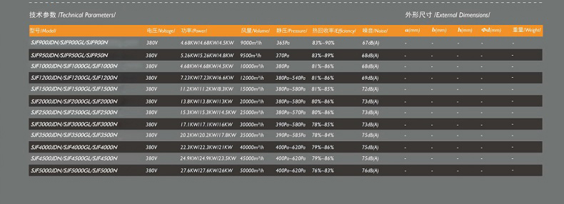 | SJF80JDN/SJF80GL/SJF80N | 220V | 188w/188w/180w | 800m3/h | 160pa | 86%-91% | 36dB(A) | 1143 | 809 | 342 | 200 | 68kg |